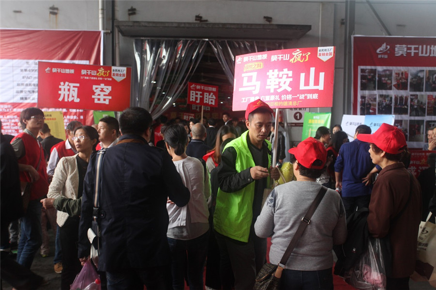 张家港莫干山品牌经销商王涛是莫干山品牌在张家港乃至华东地区的主力干将,此次他带了200多位客户到工厂来抢购莫干山地板。“到工厂来买地板,不仅仅是实惠,更重要的是现场见证企业的实力。”王涛说。
